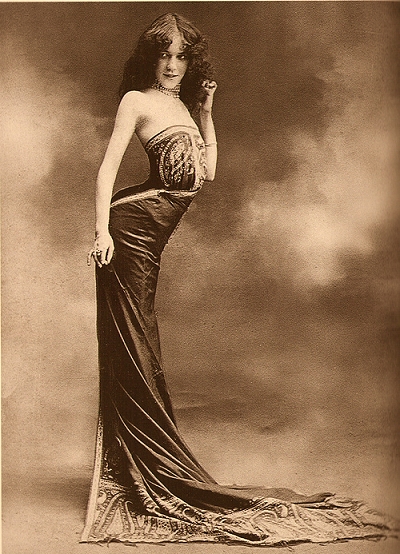 Edythe Lambelle "La Sylphe" zeigt um 1900 angeblich das Korsett Sylphide, zu sehen in: „Eine Geschichte der Reizwäsche” von Gilles Néres auf Seite 88. *