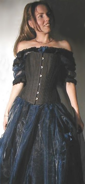 Die Anordnung der Stangen konzentriert sich mit insgesamt 18 Stangen auf den Frontbereich, wobei sich diese in einer 3x3 Anordnung im Brustbereich fächern und zum unteren Korsettrand zusammengeführt werden. Jeweils ein breiteres Stangenpaar sorgt für den gewünschten Halt in der Seite, während im Rückenteil 6 (2x3) gerade geführte Stangen, sowie jeweils ein Stangenpaar rechts und links um die Schnürösen eingesetzt sind.