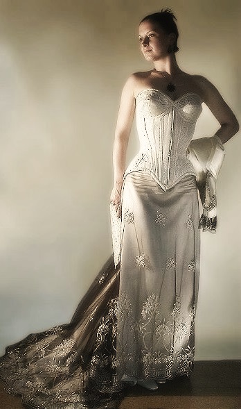 Hier das Gesamtarrangement, bestehend aus dem Korsett und einem langen Ecru-'Unterrock', einem darübergelegten opaken, dun- kleren Spitzengewebe, sowie einem Volant und einem Bolero- jäckchen.
